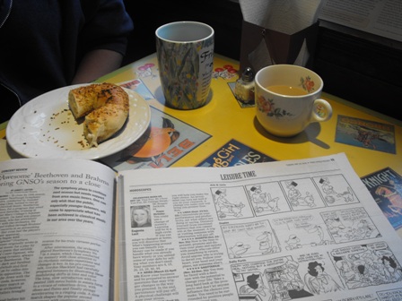 The hour unfolded rapidly and then the next. I read the newspaper, I looked around at the different tables, listened carefully to some offbeat blues, talked to Jamie about life on main street, the economy, her Yoga classes that she teaches on the side, before I ran into a friend, speculated about a hidden treasure in Greenwood Lake, and laughed at our trivial chit-chat.