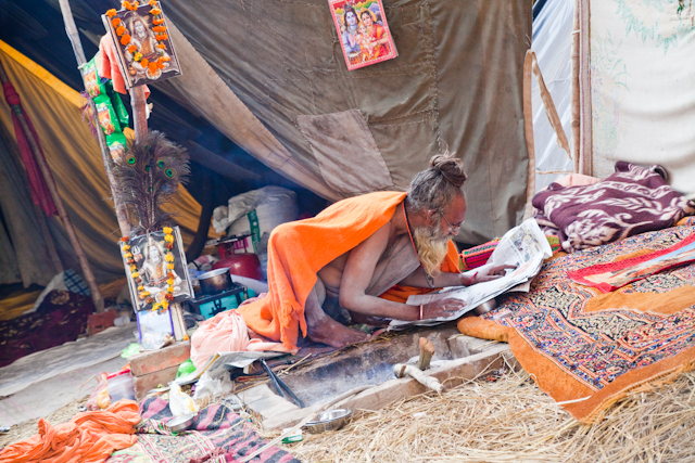 I was walking through the Juna Akhara camp (the Naga Babas), and saw this guy separate from everybody else. It's a typical scene. Their camp is surrounded by police because of past conflicts and fighting. They are militants. What is going through my mind is him reading a newspaper. This is early in the morning. They hang around. Very slow living. You can see deities, or a picture of their guru around the camps. The interesting thing is that they all have cell phones.