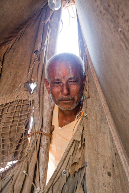 This was a tent where Babas were smoking hashish. A pilgrim peeked in the tent and then joined the group for a smoke. Again, in my photography, I often seek to capture the humanity of the individual.