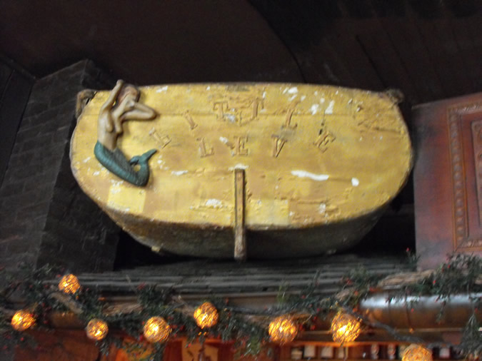 As a history buff himself, DiMartino would carry on the historical tradition, showcasing his personal collection of antique cameras, a set of printer’s type belonging to his father, and an old NY Times front cover from 1969 announcing the first landing on the moon. He also made sure that its rich history stayed intact, maintaining many of the restaurant’s historic attributes like the famous ceilings created from the old doors of the Red Swan Inn. Greg Masefied, a lifelong resident of Warwick and a good friend of Richardson helped put the doors up on the ceiling, noting that it was the cheapest thing we could find, necessity being the mother of invention. Other remnants of those former days include the dining tables supported by old, foot-driven sewing machines made by a Tuxedo sewing company; the old map of historic Paris; the hull of an old boat once owned by Richardson, and so much more coming from every pore of the structure. In the bar, when owned by the Richardson’s, DiMartino sadly noted, “Originally the walls were covered in postcards people sent from their travels. It’s too bad that we lost that piece of history after its last renovation.”