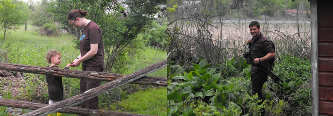 After returning from my 30 minute voyage, we shared our discoveries. Mack by this time was whittling on a piece of sculpture he had been working on earlier. The kids showed us what they brought back – some sticks and other debris from the woods. I didn’t bother picking anything up – I figured the pictures I was taking were my contribution. Mack soon helped the kids place and mash daisies on paper. I took a picture of two open doorways and suggested our morning was like an opening between two doors with infinite possibilities.